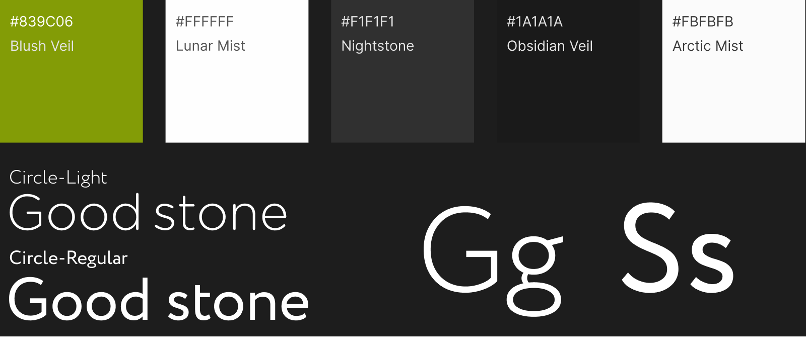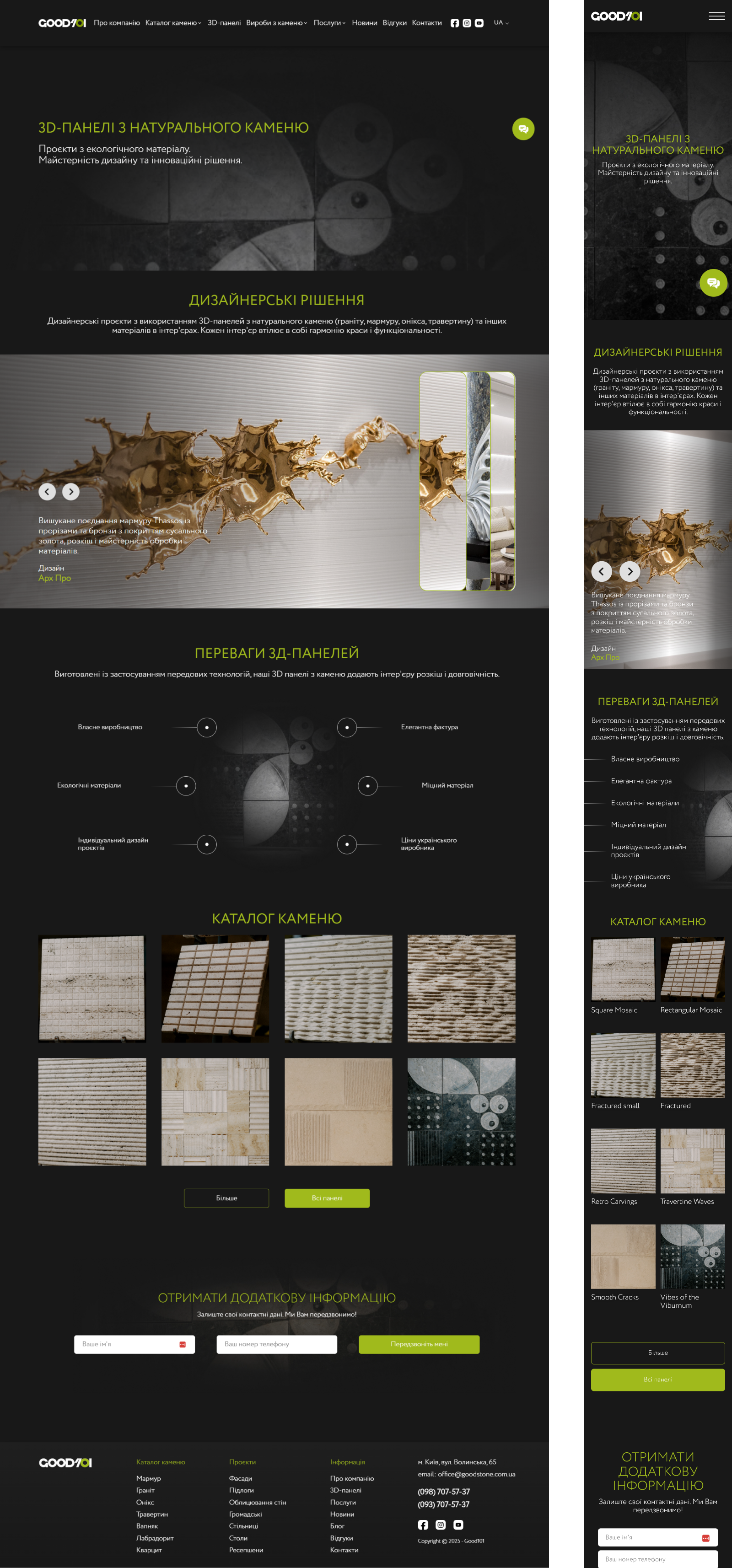 Дизайн нових сторінок побудований на контрастному поєднанні темного фону та світлих елементів, з акцентним зеленим брендовим кольором для кнопок та інтерактивних елементів. Таке рішення створює преміальне відчуття і дає змогу максимально ефектно представити фотографії виробів з каменю. Типографіка базується на сучасному шрифті Circle, що забезпечує чудову читабельність і підтримує преміальний характер бренду.