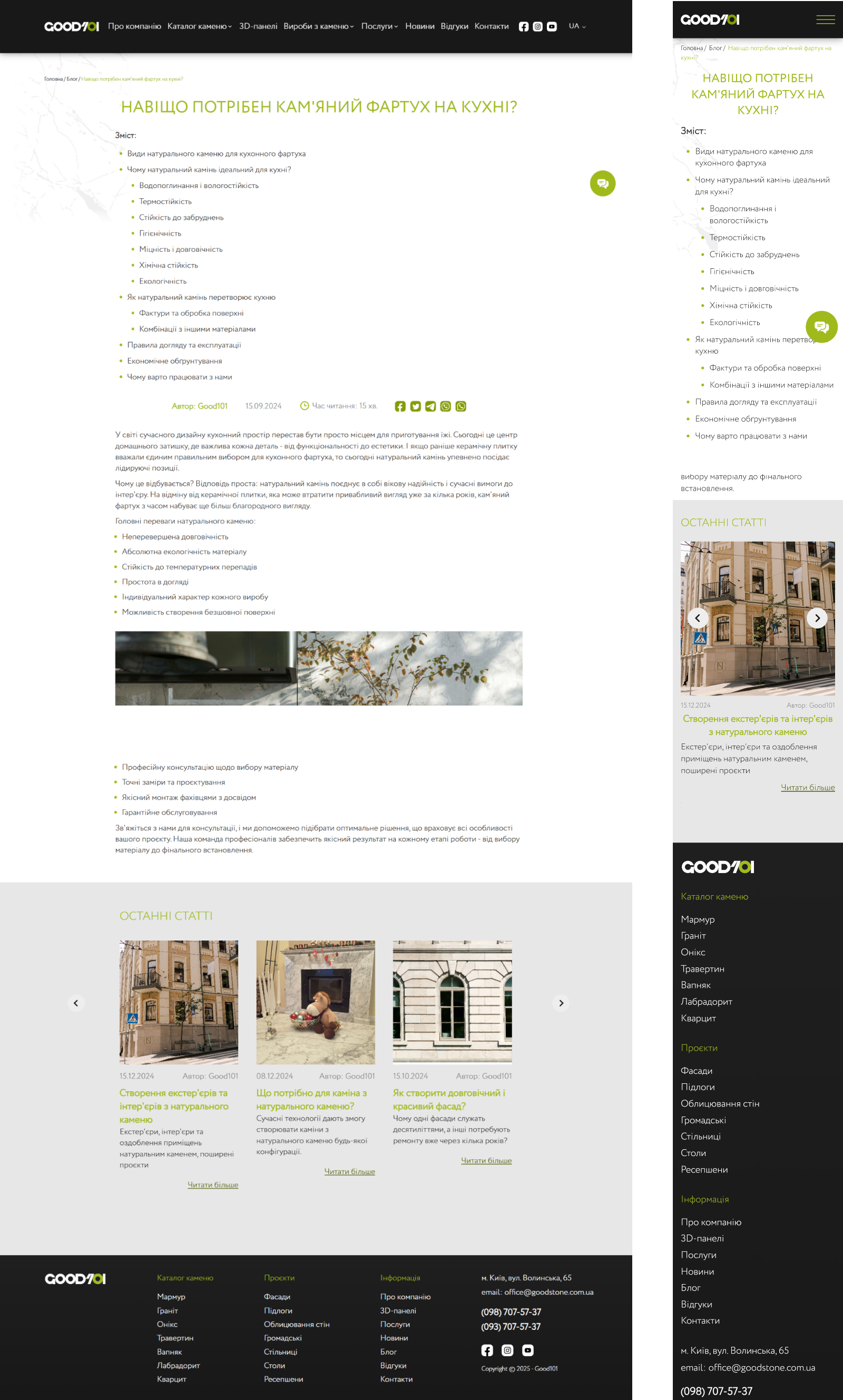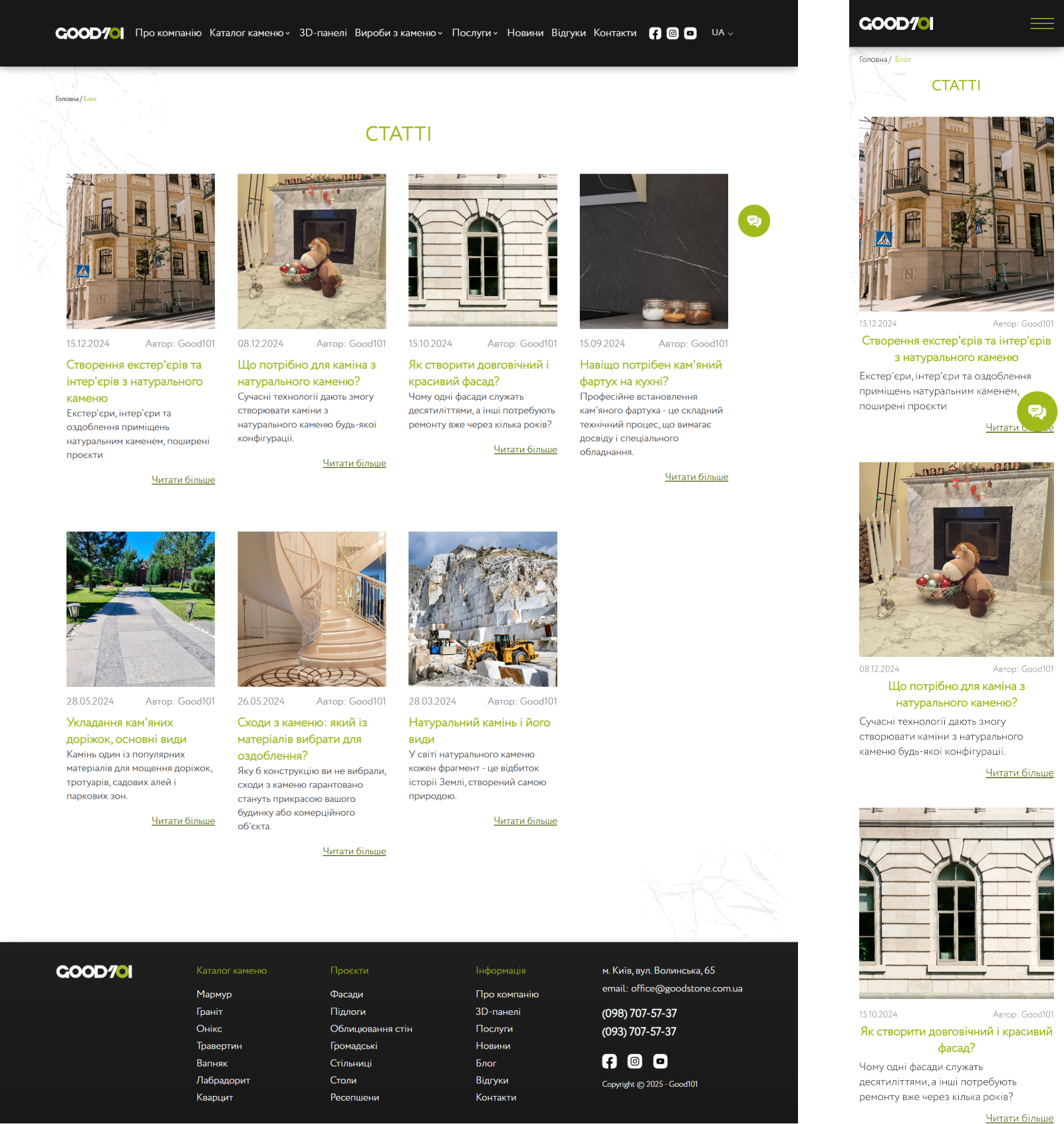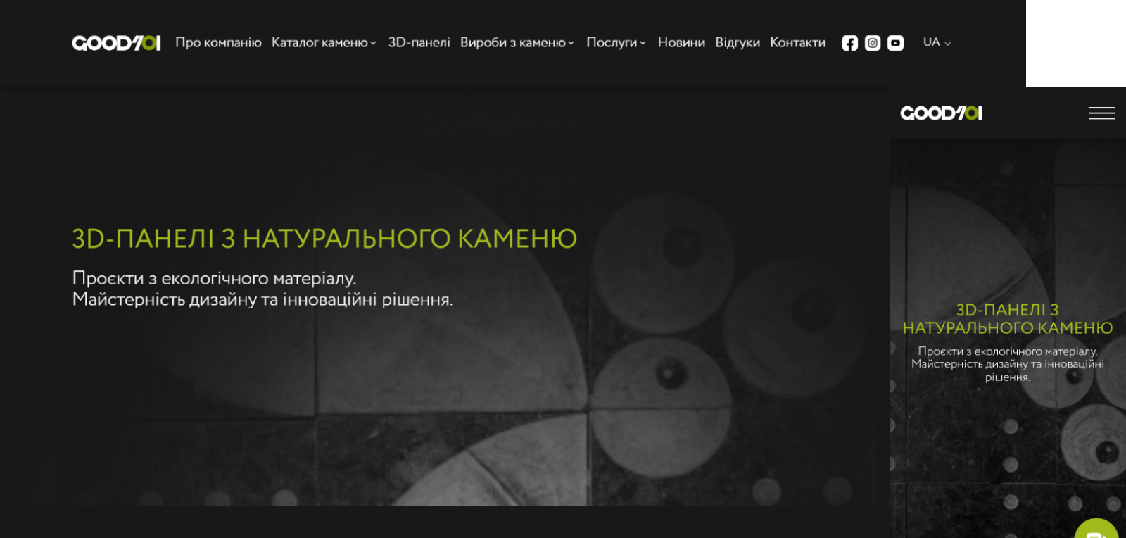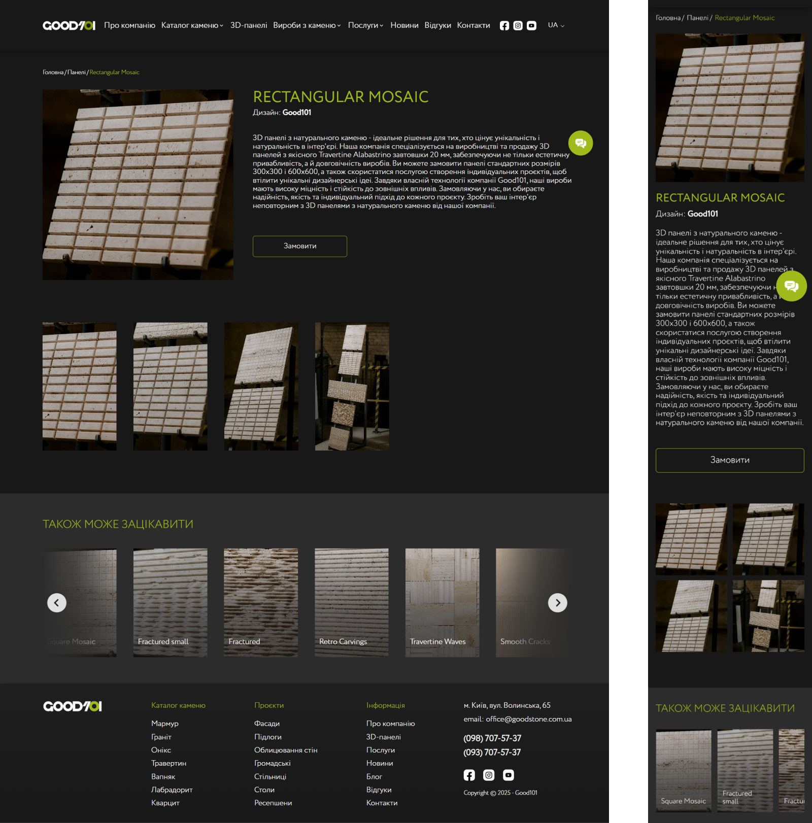 Під час двомісячного проєкту ми здійснили комплексну розробку нових розділів сайту для компанії Good101. Основним завданням стало створення повноцінної презентації нового продукту - 3D-панелей з натурального каменю. Для цього було розроблено детальну структуру з основною сторінкою, каталогом продукції та індивідуальними картками кожної 3D-панелі. Додатково ми впровадили інформаційну складову сайту, створивши розділи блогу та новин компанії, що дало змогу більш повно розкрити експертизу бренду в роботі з каменем.