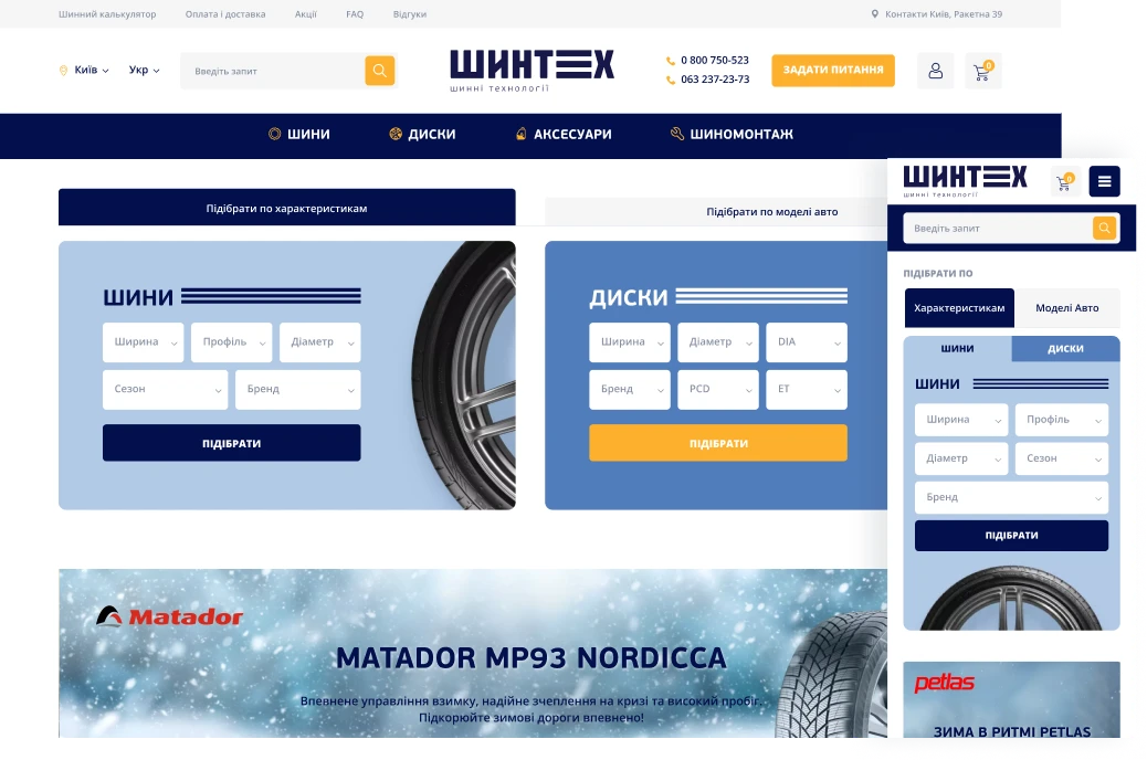 Шинтех - експерти в галузі підбору та продажу автомобільних шин з досвідом роботи понад 15 років. Застарілий сайт на Бітрікс перестав відповідати сучасним вимогам бізнесу, що стало причиною розробки нової платформи та оновлення дизайну.
