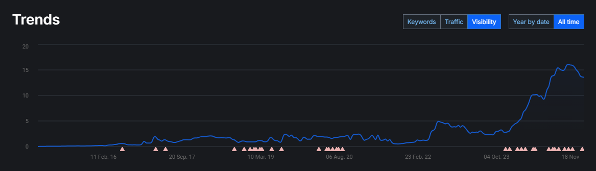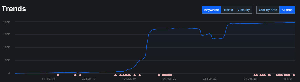 У результаті реалізованої стратегії просування нам вдалося подолати технічні обмеження платформи і досягти поставлених цілей. Ключові запити в тематиці сумок були успішно виведені в топ пошукової видачі, водночас значно покращилася якість трафіку, що залучається. Важливим досягненням стало не тільки поліпшення позицій сайту, а й підвищення конверсії, що безпосередньо позначилося на прибутку клієнта. Ба більше, наші рекомендації щодо поліпшення функціоналу CMS було прийнято розробниками платформи та реалізовано в масштабному оновленні системи, що позитивно вплинуло на розвиток не тільки цього проєкту, а й інших сайтів на цій платформі.