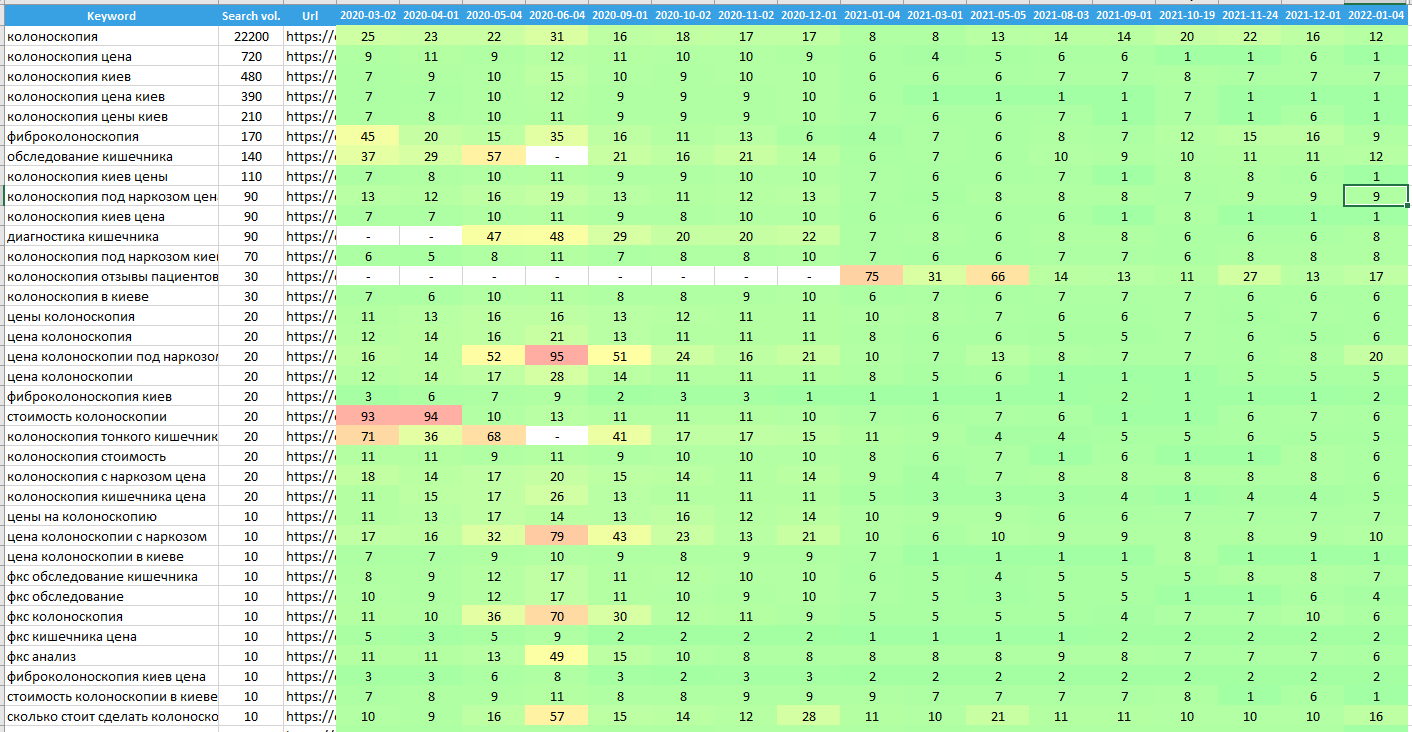Після проведення комплексної оптимізації сайту наша стратегія принесла відчутні результати, забезпечивши поступовий вихід у ТОП Google за ключовими запитами. Ми успішно обійшли багато агрегаторів і великих медичних порталів за цільовими запитами, а також Вікіпедію за інформаційними. Незважаючи на складнощі, карантинні обмеження і бойові дії в країні, що впливали на поведінкові фактори, і постійно мінливі тенденції в пошукових запитах, нам вдалося досягти поставлених цілей. Завдяки цьому успіху клієнт довірив нам подальше просування і розробку стратегії, що дало йому змогу зосередитися на роботі з відвідувачами і розширенню своєї клініки на інші напрямки.