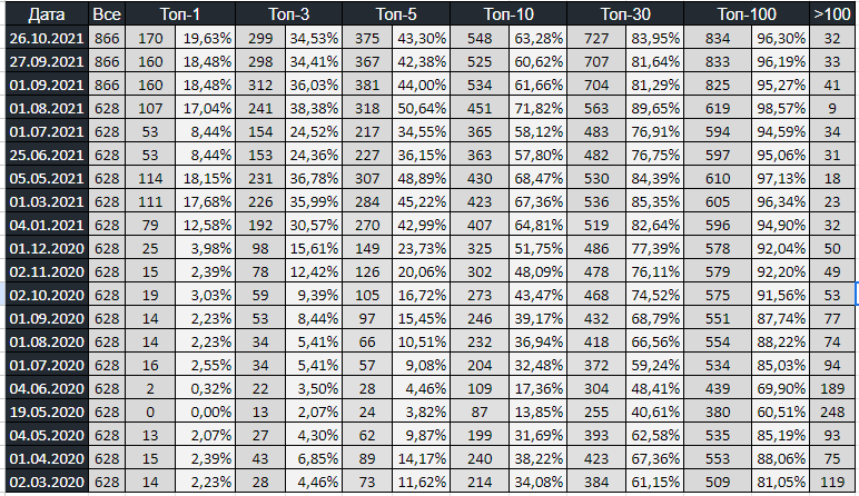 | ТОП 30 | 19,11% | 83,95% |