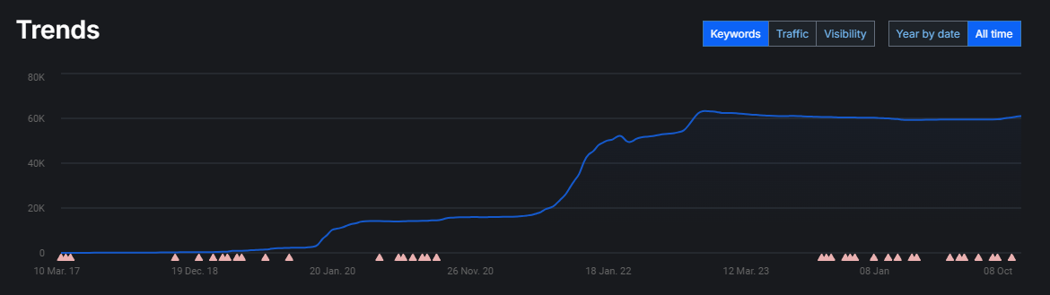 Просування сайту почалося з кінця 2019 року і триває донині. Частина показників за останні роки прихована.