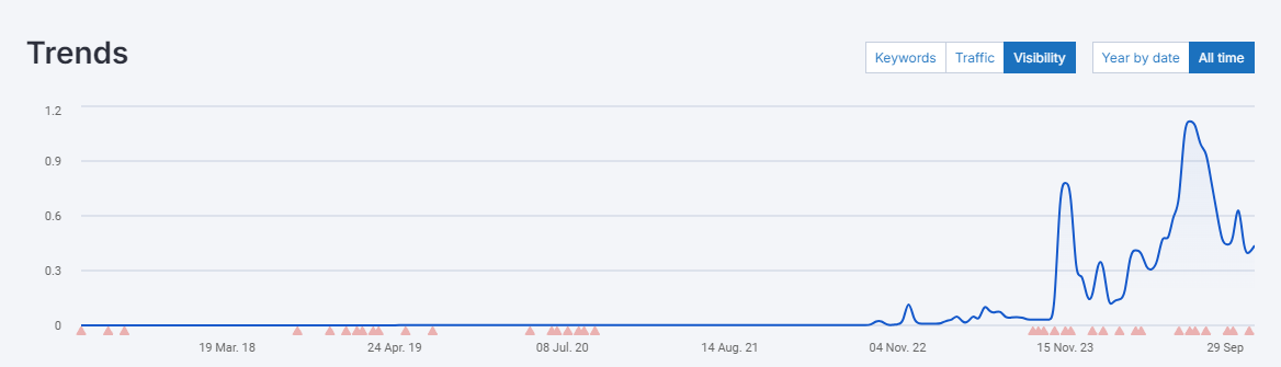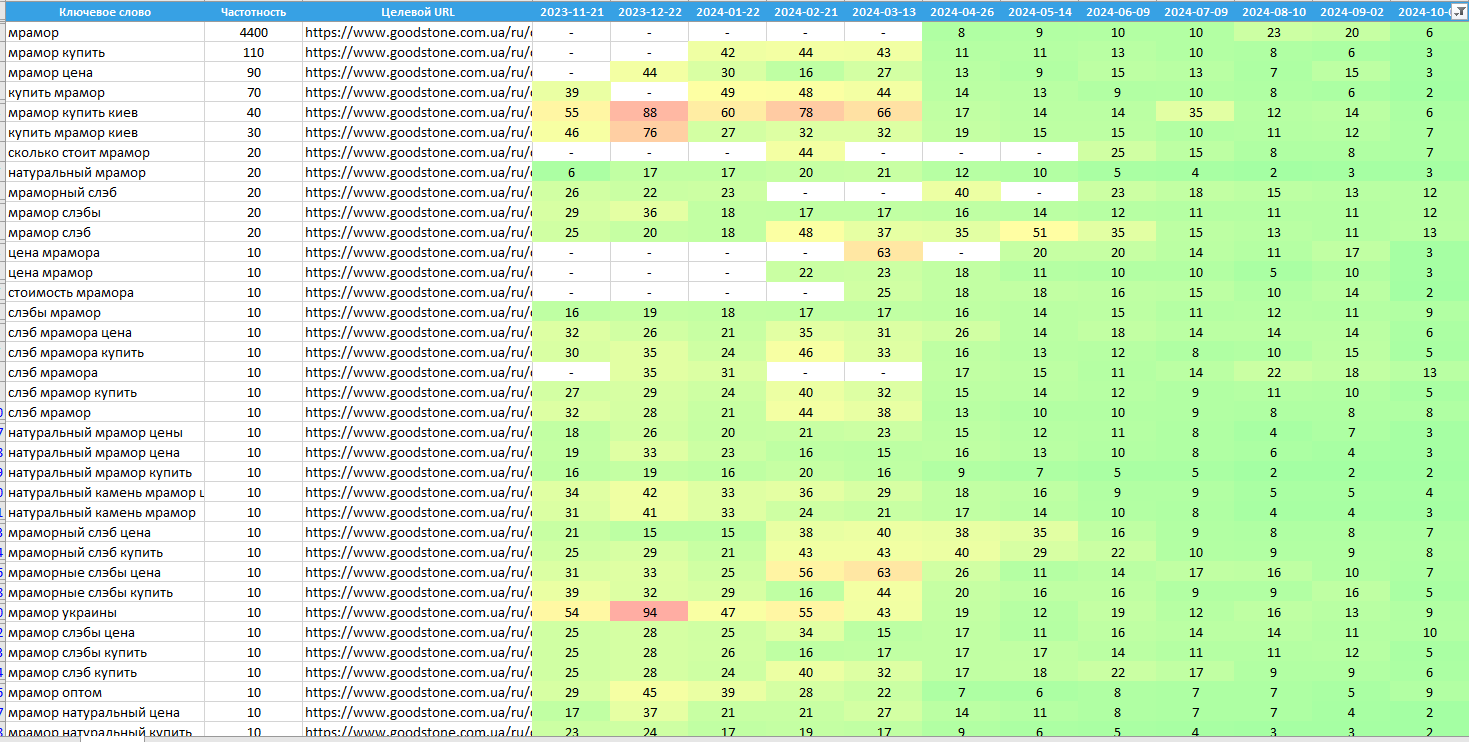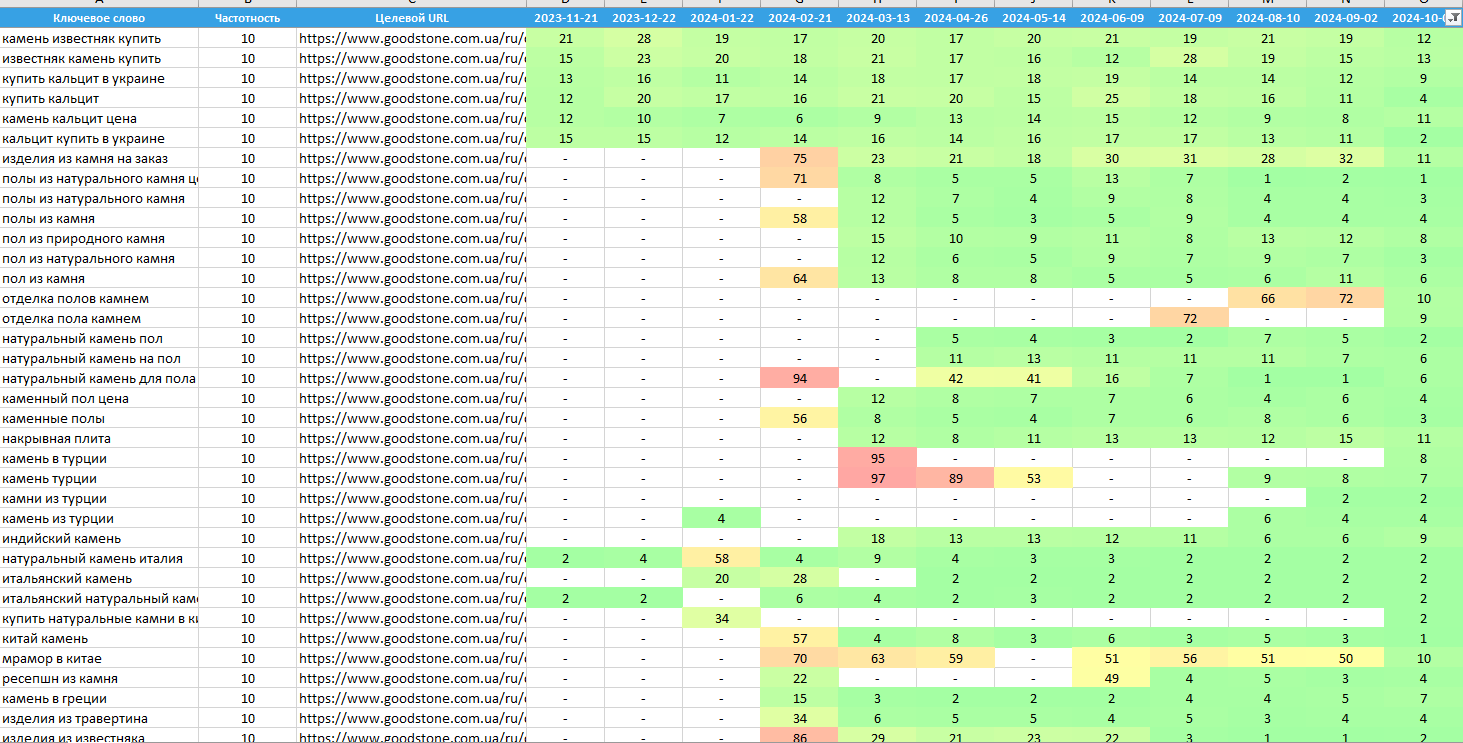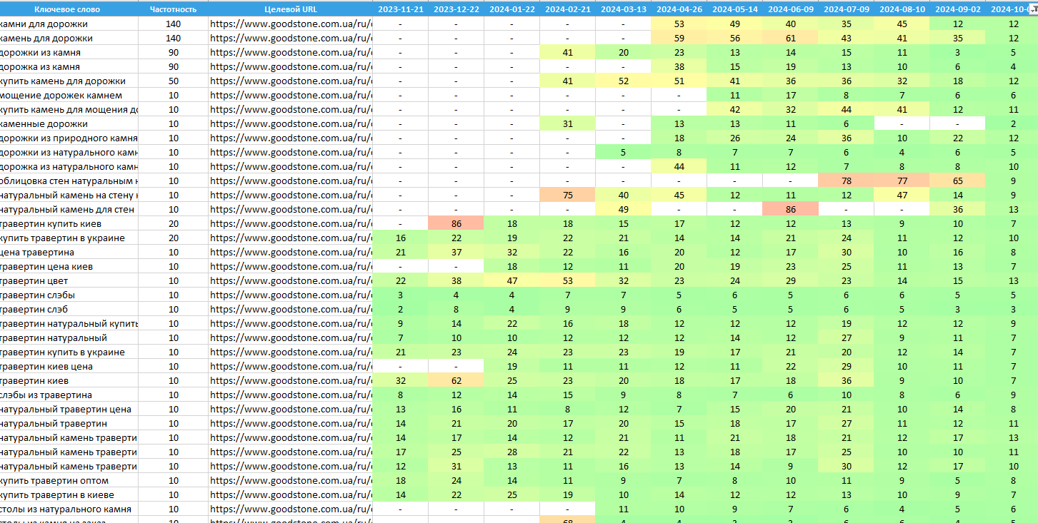 Просування сайту компанії Good101 показує значний прогрес, хоча робота ще триває. Ми постійно знаходимо нові можливості для розширення та оптимізації ресурсу, регулярно оновлюючи асортимент і додаючи інформацію про завершені проєкти. За багатьма ключовими запитами сайт уже посів лідерські позиції, проте наша кінцева мета - домогтися стабільної присутності в ТОП-3 видачі за всіма запитами, пов'язаними з натуральним каменем і елементами екстер'єру та інтер'єру. Це амбітне завдання, але поточні результати і постійне вдосконалення сайту наближають нас до його досягнення.