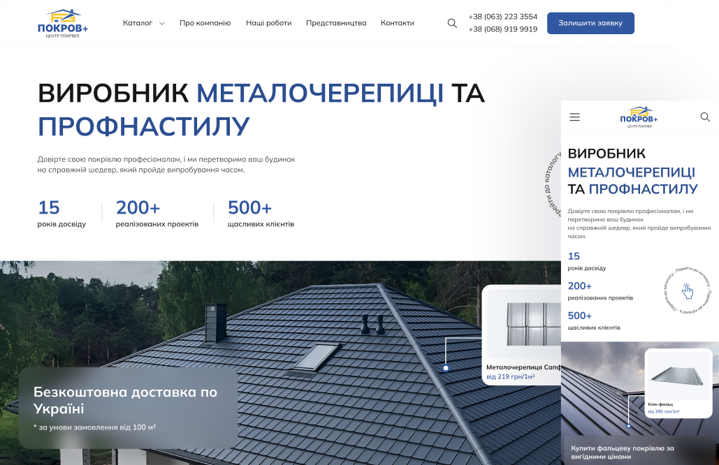 Pokrov+ has been producing roofing and facade materials for over 15 years. The company's previous website on the Google Sites platform could barely cope with the growing demands of the building materials market. It was decided to create a modern catalog site where customers can easily find roofing solutions and order consultations.