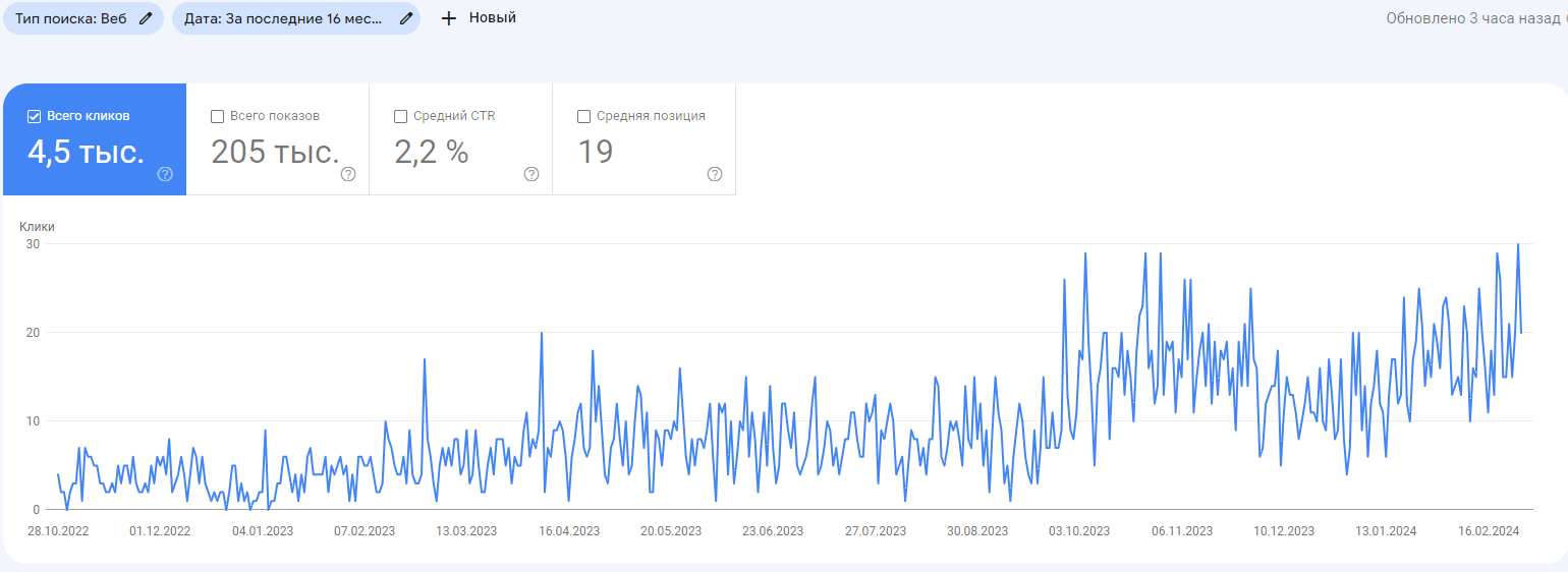 *I would like to make a note that with the outbreak of hostilities, work on the site stopped for a long time, it took more than a year for the client to set up all the processes anew and allocate a budget for promotion.